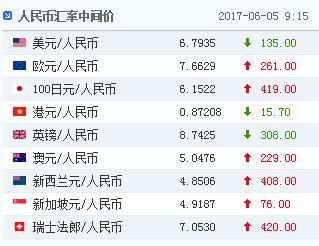 中国人民银行授权中国外汇交易中心公布,2017年6月5日银行间外汇市场人民币汇率中间价为:1美元对人民币6.7935元,1欧元对人民币7.6629元,100日元对人民币6.1522元,1港元对人民币0.87208元,1英镑对人民币8.7425元,1澳大利亚元对人民币5.0476元,1新西兰元对人民币4.8506元,1新加坡元对人民币4.9187元,1瑞士法郎对人民币7.0530元,1加拿大元对人民币5.0338元,人民币1元对0.62935马来西亚林吉特,人民币1元对8.3212俄罗斯卢布,人民币1元对1.8856南非兰特,人民币1元对164.58韩元,人民币1元对0.54066阿联酋迪拉姆,人民币1元对0.55201沙特里亚尔,人民币1元对40.1514匈牙利福林,人民币1元对0.54623波兰兹罗提,人民币1元对0.9712丹麦克朗,人民币1元对1.2696瑞典克朗,人民币1元对1.2401挪威克朗,人民币1元对0.51615土耳其里拉,人民币1元对2.7570墨西哥比索。
